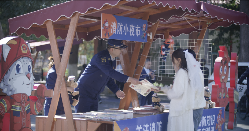 圖為伊犁州消防救援支隊在伊寧市六星街設置“消防小夜市”消防宣傳打卡點,與游客互動。曹權攝