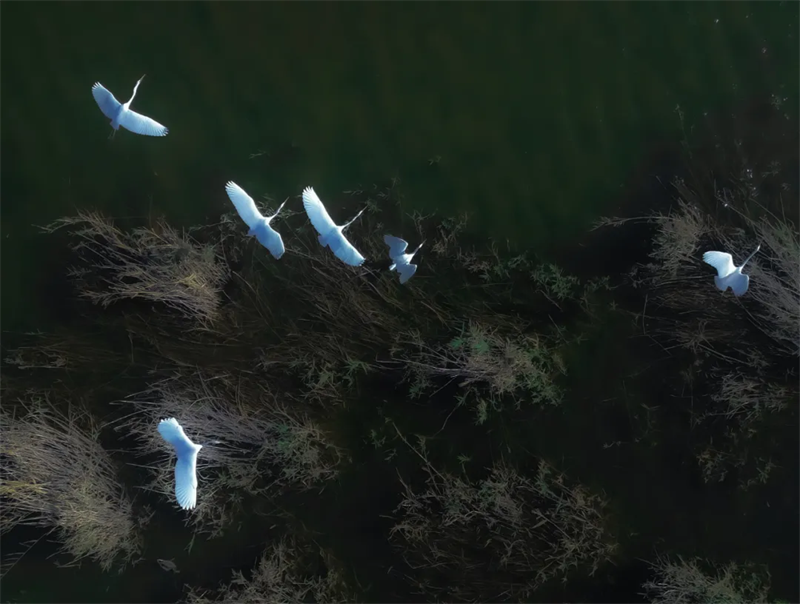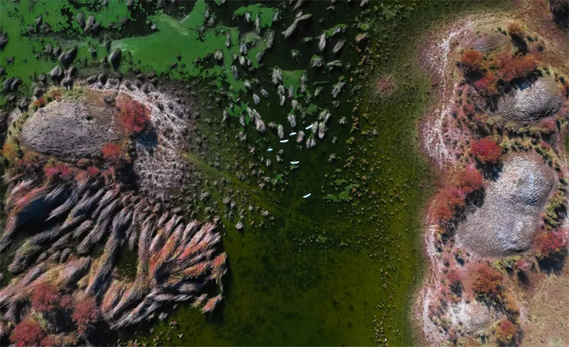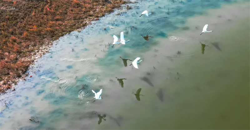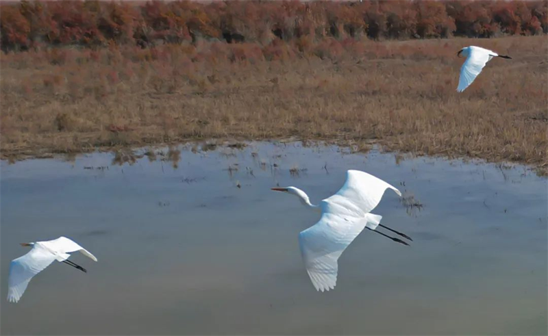 11月10日,在第二師二十二團周邊的黃水渠濕地廣袤的灘涂上,成群的白鷺宛如優雅的精靈在此覓食嬉戲、蹁躚起舞。