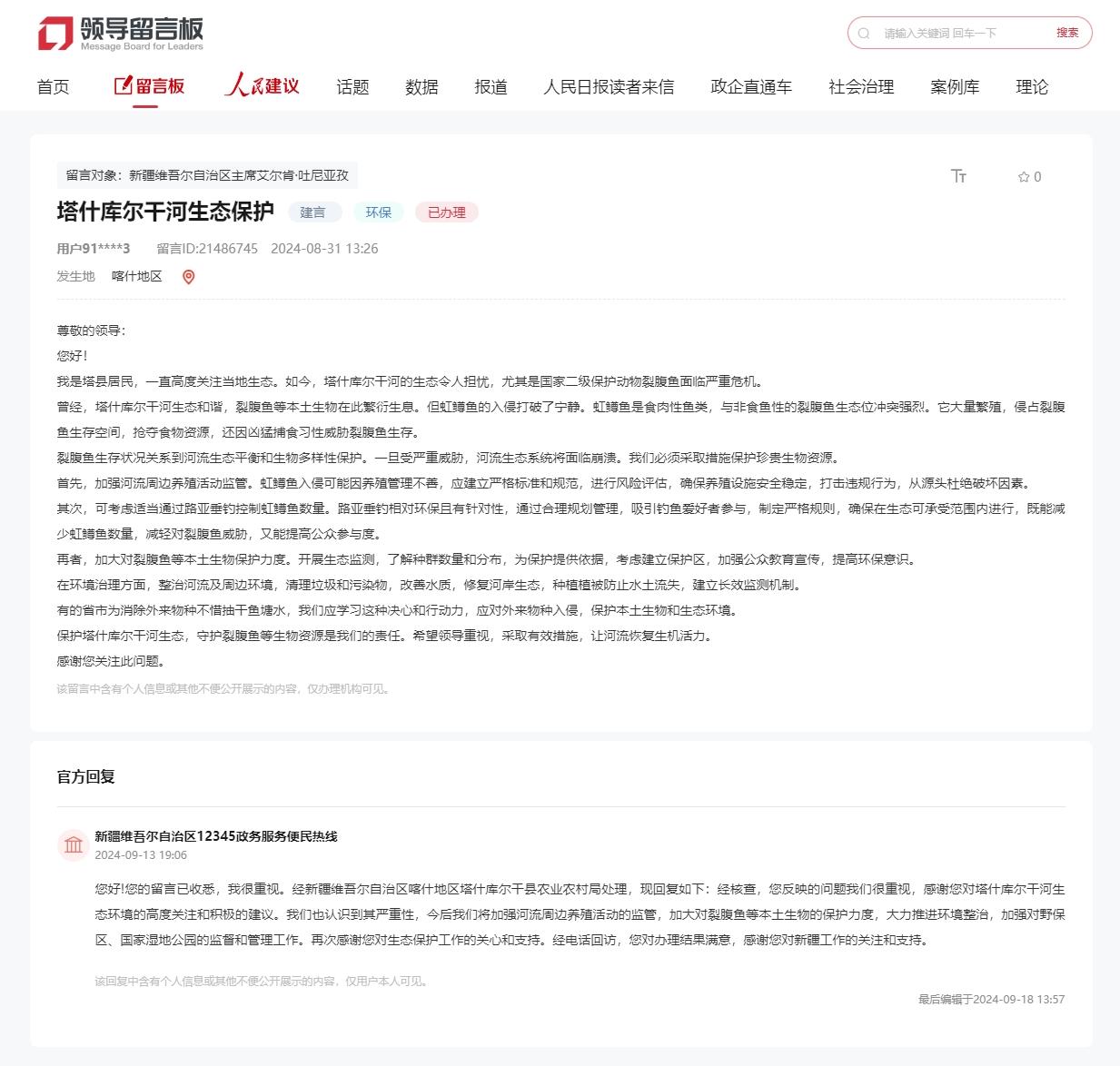 人民網烏魯木齊11月14日電 (記者韓婷)生態文明建設,功在當代,利在千秋。近日,有群眾給新疆維吾爾自治區主席版塊留言,建議加強塔什庫爾干河生態保護,守護裂腹魚等生物資源。