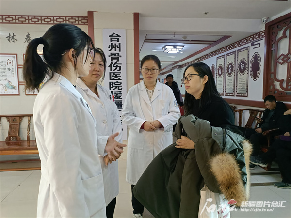 12月4日,醫療援疆專家呂建琴(右二)與浙江大學醫學院附屬邵逸夫醫院新疆兵團阿拉爾醫院醫護人員交流于熙攝