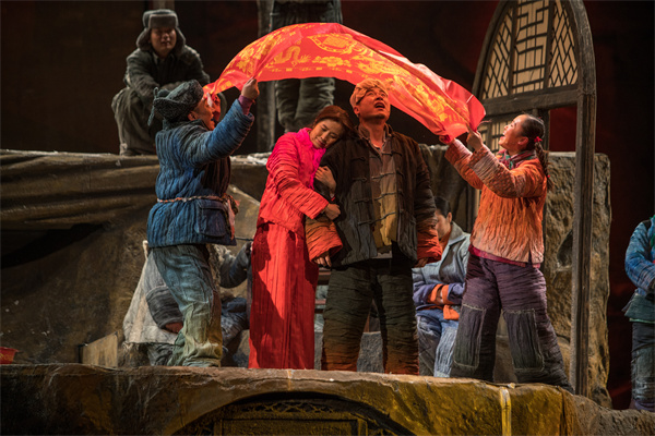 在演出中,一個由巨大碾子構成的360度旋轉舞臺,串聯起陜北鄉村和城鎮的景致,山坡、田野、鄉道、窯洞等,將觀眾帶入故事發生的真實環境。此外,該劇在服裝、化妝、道具上,在保證符合當時人群衣著、飾物、生活用具的基礎上,做了舞臺化效果呈現,拉近了觀眾與幾十年前社會面貌的距離。