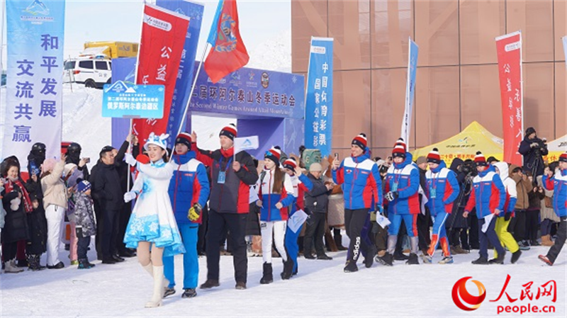 1月12日,第二屆“冰雪絲路 中國雪都”環阿爾泰山冬季運動會在阿勒泰將軍山國際滑雪度假區開幕。圖為俄羅斯阿爾泰邊疆區代表隊入場。人民網 王欲然攝