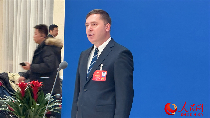 新疆政協委員、塔什庫爾干塔吉克自治縣政協主席庫爾班庫力·卡馬斯在委員通道回答記者提問。人民網記者 楊睿攝