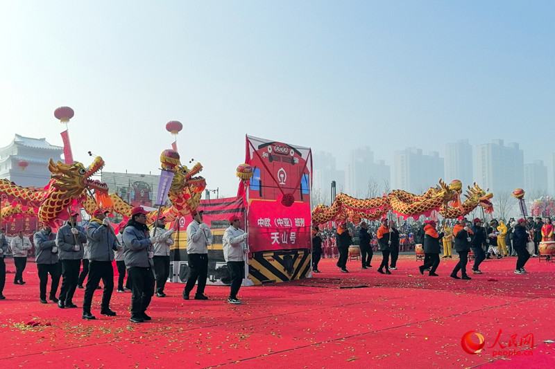 “中歐班列天山號”展板亮相烏魯木齊社火展演。人民網記者 韓婷攝