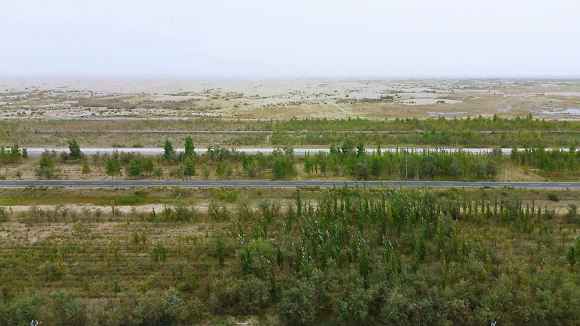 ——策勒縣因地制宜,利用溝河堤壩攔截流沙,低矮灌草就地固沙,并結合人工灌木林和窄帶多帶式防風林對風沙進行雙重阻截。這一模式得到廣泛應用,助力更多地區實現從“沙進人退”到“綠進沙退”的轉變。