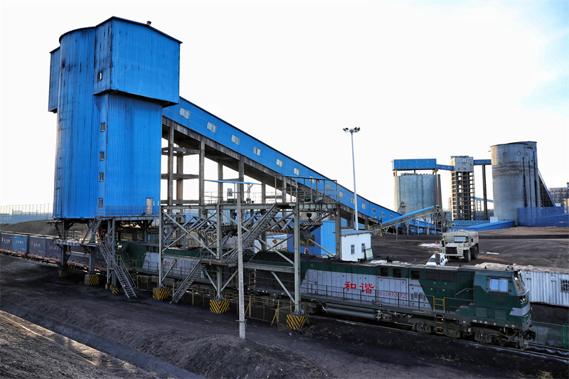 一列貨運列車在準東經濟技術開發區準東北站鐵路環線內裝運煤炭。擺風亮攝
