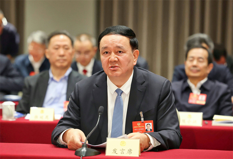 3月5日下午,全國政協委員、新疆維吾爾自治區政協主席努爾蘭·阿不都滿金在全國政協十四屆三次會議中共界別小組會議上發言。自治區政協供圖