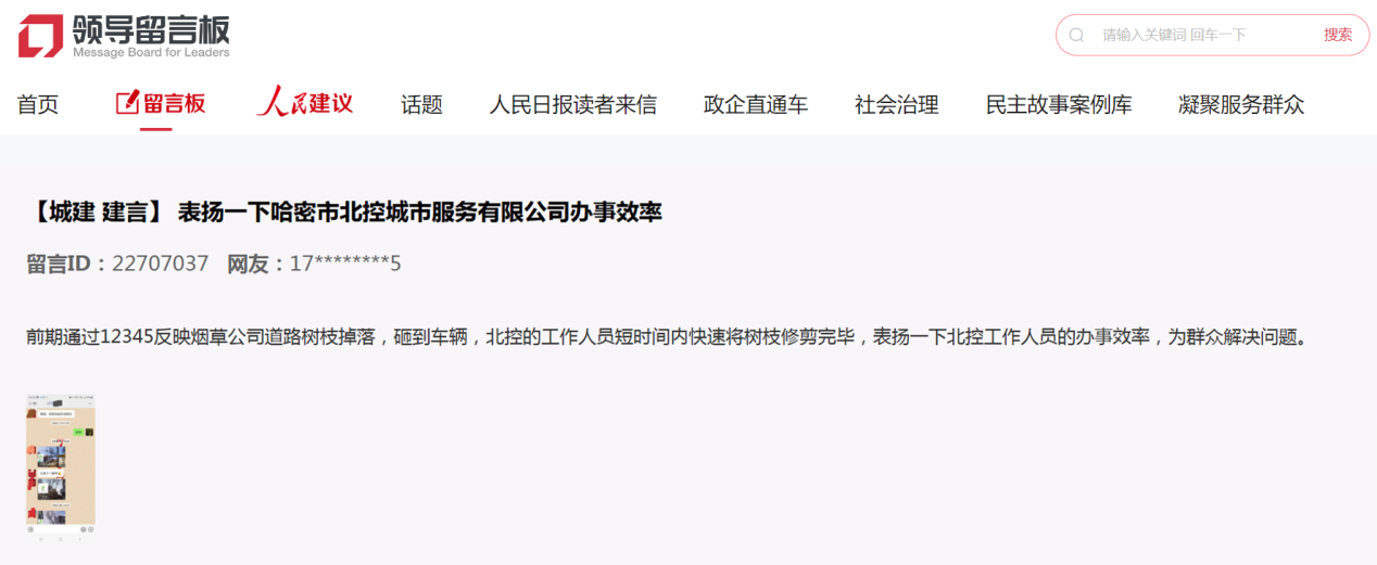 3月26日,哈密市一網友通過人民網“領導留言板”,為工作人員辦事效率點贊。