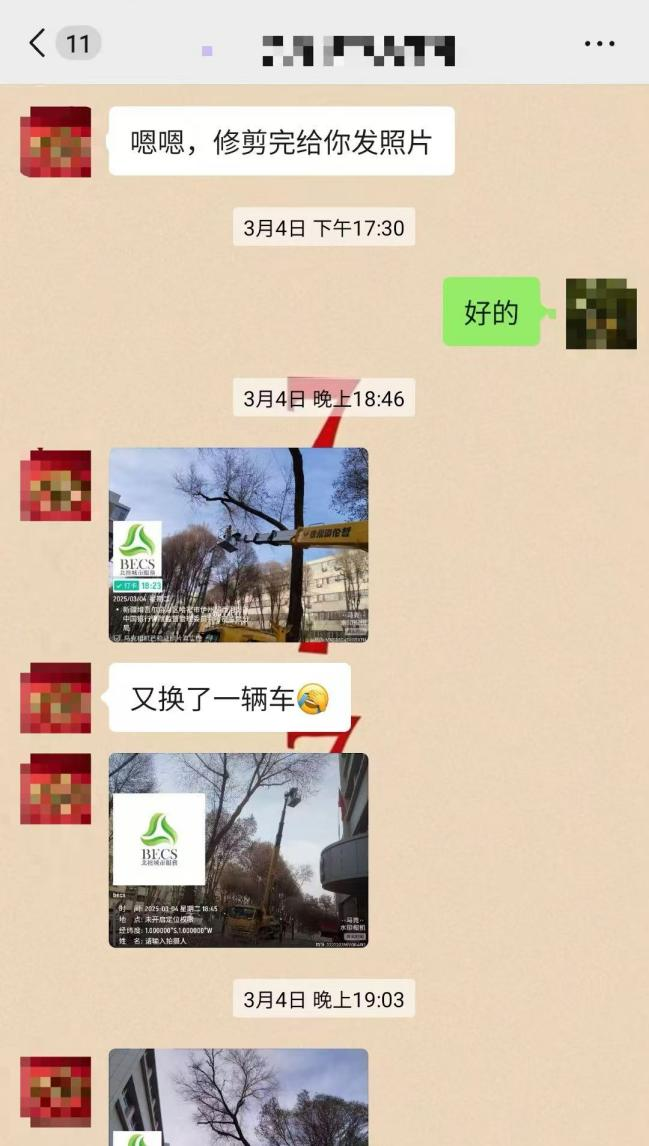 今年2月,網友韓女士車輛在停放過程中被掉落樹枝砸到,便通過留言渠道向哈密市政府部門反映,在收到留言后,當天哈密市北控城市服務有限公司便派專人前往現場勘查情況,由于作業區屬于市區路段,車輛及行人較多,為確保安全,哈密市北控城市服務有限公司與交警大隊和煙草公司協調,先后調配兩臺高空作業車輛進行作業,目前留言問題已辦理完畢。