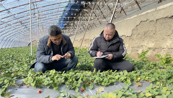 王志剛與同事一起測量草莓甜度、大小和生長情況。