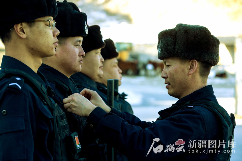 道浪特邊境派出所副所長阿思里別克為民輔警整理著裝。楊斌攝