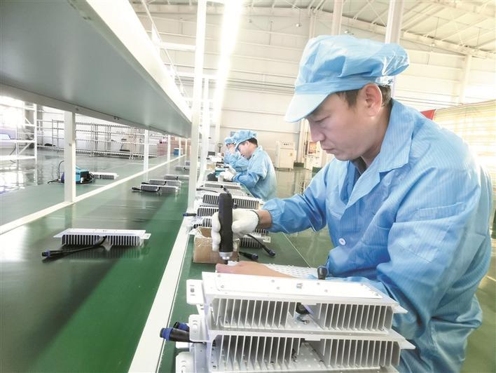 垂天科技(新疆)有限公司智能路燈燈桿組裝車間的員工在生產線上忙碌(資料圖片)。趙海忠 攝