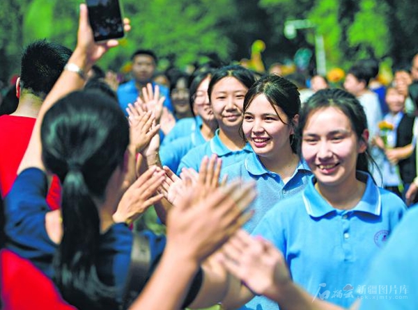 6月5日,烏魯木齊市第五十四中學高三學子和家長、老師擊掌。當日,該校為高三學子舉行高考出征壯行儀式。石榴云/新疆日報記者鄒懿攝