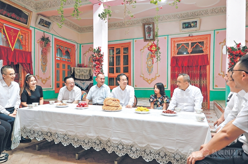 7月22日至23日,自治區黨委書記、兵團黨委第一書記、第一政委陳小江,自治區黨委副書記、自治區主席艾爾肯·吐尼亞孜在喀什地區、克孜勒蘇柯爾克孜自治州和兵團草湖項目區調研。這是7月22日,陳小江、艾爾肯·吐尼亞孜來到喀什市乃則爾巴格鎮前進村看望托乎提·依明一家。 石榴云/新疆日報記者崔志堅攝