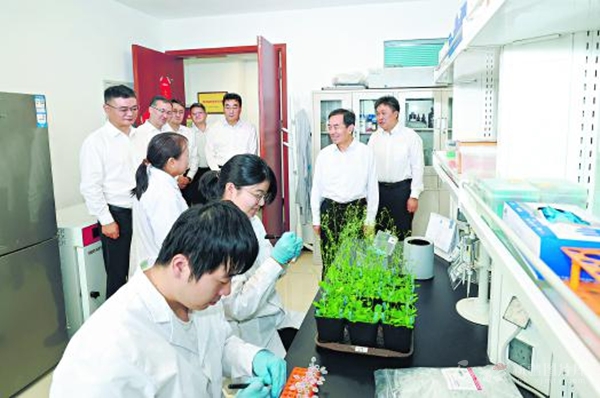8月11日,自治區黨委書記、兵團黨委第一書記、第一政委陳小江在昌吉回族自治州和兵團第六師五家渠市調研。這是陳小江來到位于昌吉市的中國農科院西部農業研究中心,了解科技研發促進農業增效、農民增收情況。 石榴云/新疆日報記者崔志堅攝