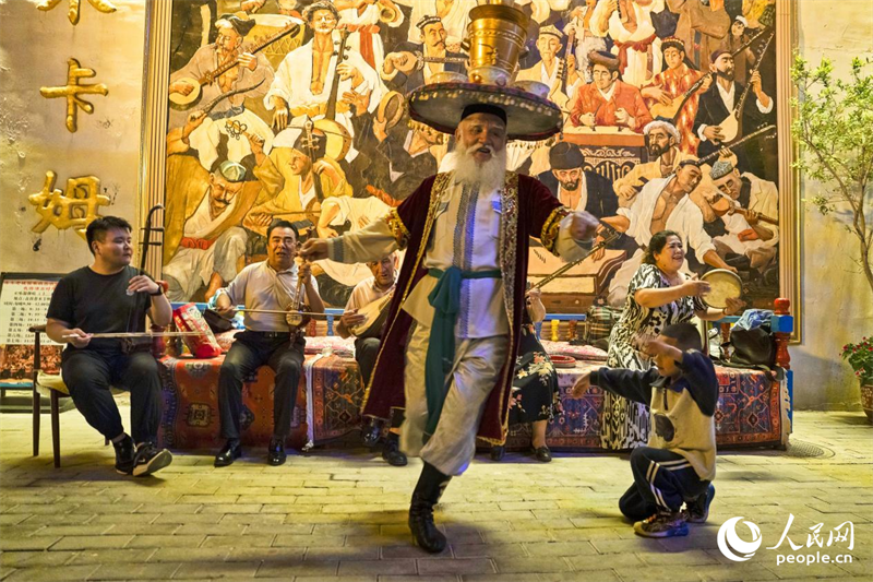 自治區級非物質文化遺產項目薩瑪瓦爾舞傳承人向游客展示龜茲樂舞魅力。人民網記者 唐宋攝