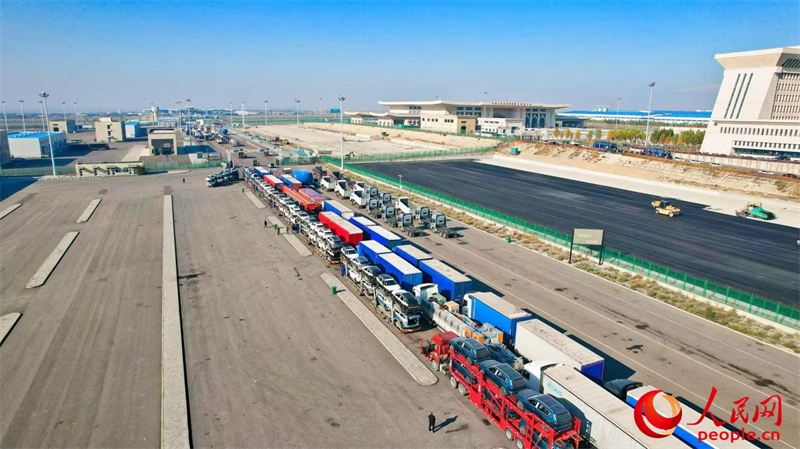 霍爾果斯公路口岸排隊出境的車輛。人民網 李欣洋攝