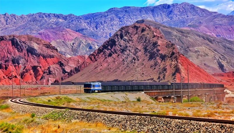 一列貨運列車行駛在群山中。中國鐵路烏魯木齊局集團有限公司供圖