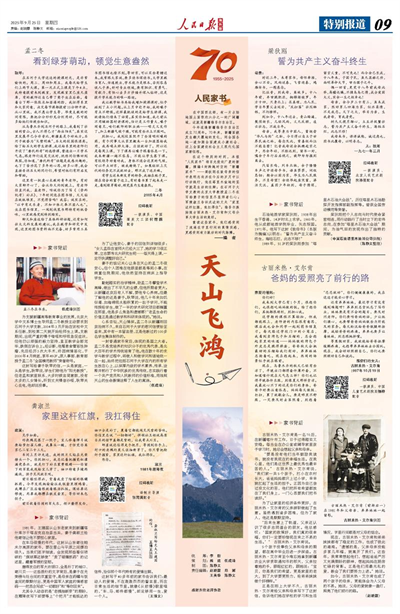 在這個特別的時刻,本報“人民家書”將目光投向廣袤的新疆,摘編4封跨越時空的“新疆家書”——梁狄剛在致母親的信中表明志向并在今后的歲月中以行動踐行,他在塔里木盆地的堅守就是生動的注腳;在石河子大學支教的北京大學教授孟二冬在寫給妻子的信里盡顯師者仁心;軍嫂淑蘭告訴戍邊的丈夫“家里這桿紅旗,我扛得住”;維吾爾族姑娘古麗米熱·艾爾肯和父母分享大學生活的美好。