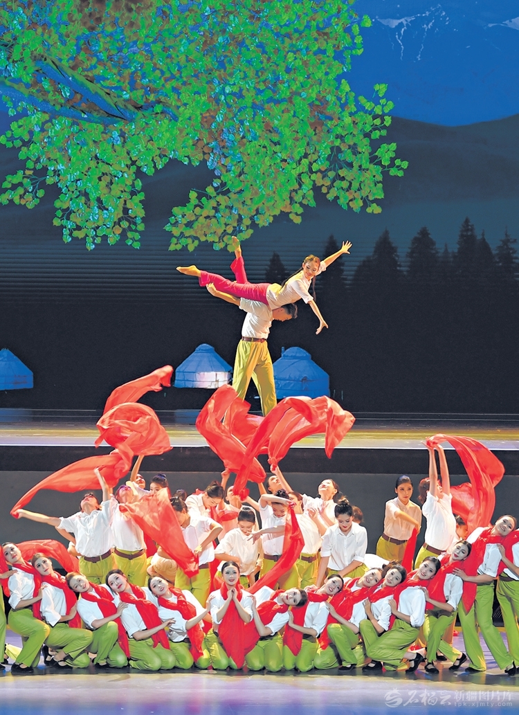 9月24日晚,慶祝新疆維吾爾自治區成立70周年文藝晚會《美麗新疆》在烏魯木齊文化中心大劇院舉行。圖為節目《天山青松根連根》《燃情歲月》《我的愛獻給祖國母親》。石榴云/新疆日報記者蔡增樂、湯永攝