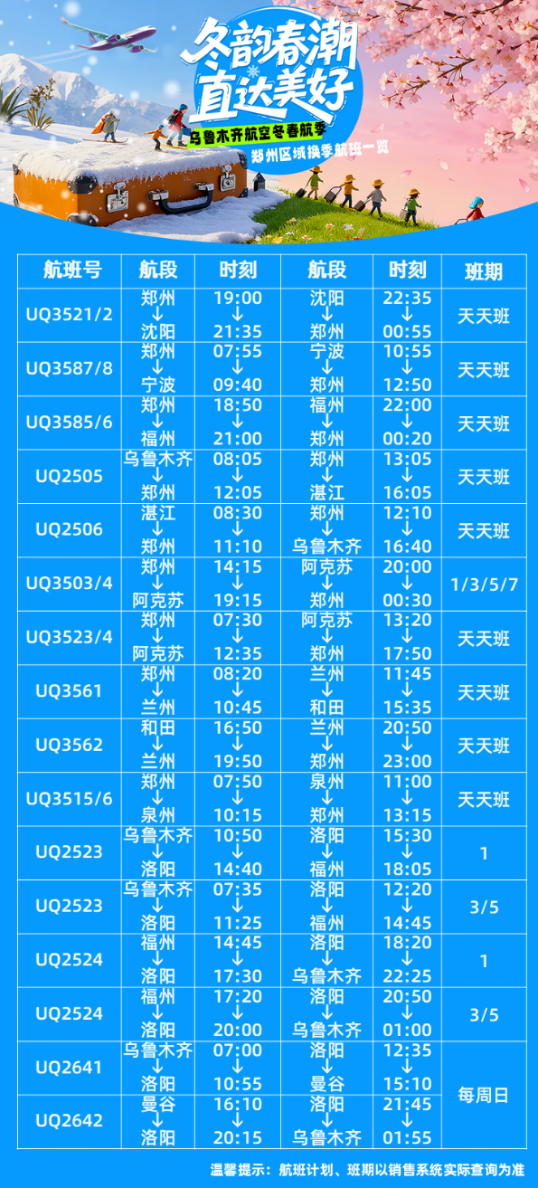 持續運營的鄭州=蘭州=和田(每日一班)、鄭州=泉州(每日一班)、烏魯木齊=洛陽=福州(每周1/3/5)航線,緊緊筑牢中原與西北邊疆、東南沿海的空中紐帶;鄭州=阿克蘇航線在每日一班基礎上,新增每周1/3/5/7執飛航班,實現班期加密。此外,烏魯木齊=洛陽=曼谷國際航線將由每周一調整為每周日執行一班,進一步便利豫泰兩地人員往來與文旅商貿合作。