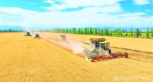 奇臺縣半截溝鎮腰站子村,農機手駕駛聯合收割機收獲小麥(7月10日攝)。何龍攝 圖片由新疆圖片庫提供