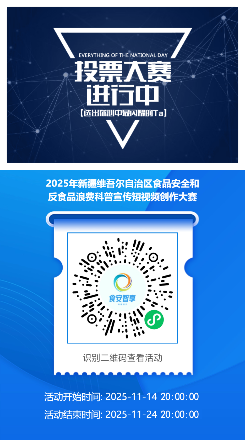 投票人員可直接掃描“食安智享”微信小程序投票二維碼(見附件),也可通過“新疆市場監管”微信公眾號頁面底部“了解我們”欄目,進入“食安智享”頁面,點擊“2025年新疆維吾爾自治區食品安全和反食品浪費科普宣傳短視頻創作大賽”進入頁面參與投票。