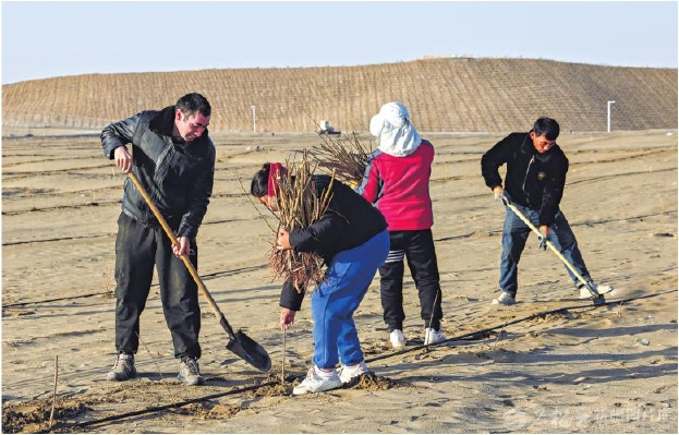 11月23日,群眾在民豐縣后河壩治沙點植綠。許曉龍攝
